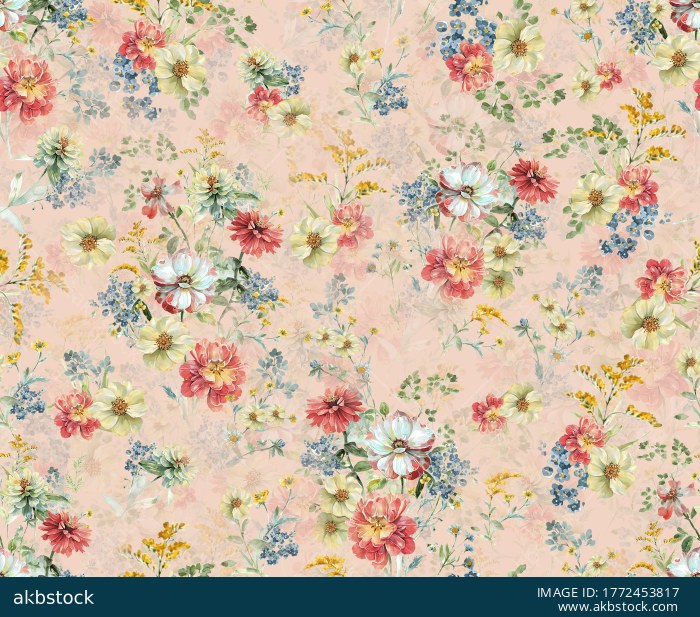 This seamless watercolor floral pattern is set on a soft blush peach background, featuring coral and pink garden blooms, creamy yellow flowers, airy green foliage, and delicate blue berry sprigs. The look is fresh, romantic, and elegant—perfect for women’s apparel, kidswear, scarves, bedding, curtains, wallpaper, stationery, and premium surface design use. Created as a continuous repeat for smooth all-over printing.