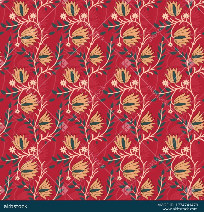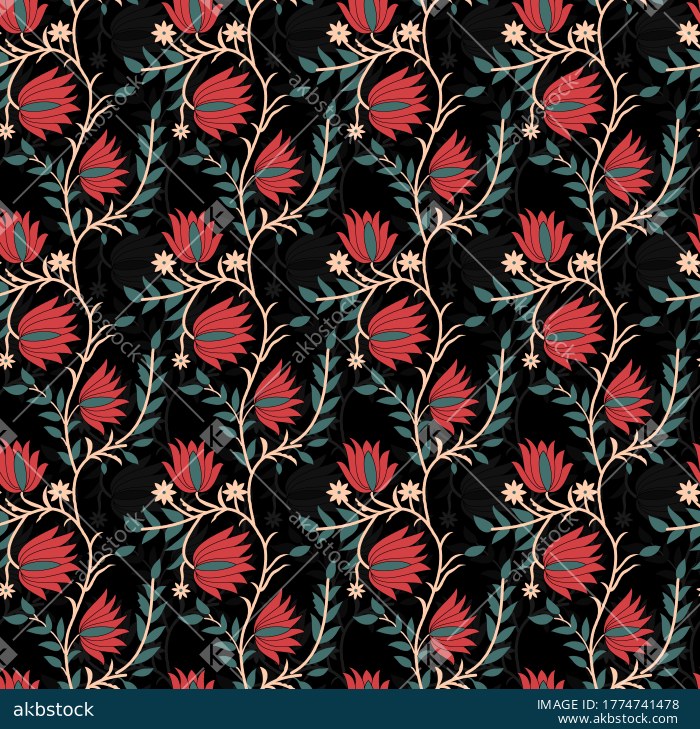 A striking seamless floral pattern featuring bold red blossoms, flowing beige vines, teal leaves, and delicate cream flowers set against a deep black background. The design has a dramatic decorative appeal with a balanced allover arrangement that blends modern elegance with a folk inspired botanical style. Ideal for apparel fabrics, kurti prints, home décor textiles, statement fashion surfaces, and premium surface design collections.