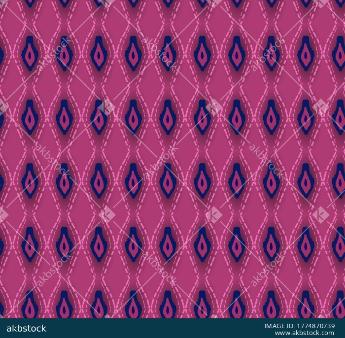 A vibrant seamless geometric pattern featuring bold navy ikat inspired diamond motifs arranged in a neat allover repeat over a rich pink background. The contrast between deep blue forms and soft stitched style linear detailing gives this design a striking ethnic modern character, making it suitable for fashion fabrics, ethnic wear, scarves, home décor textiles, and eye catching printed surface applications.