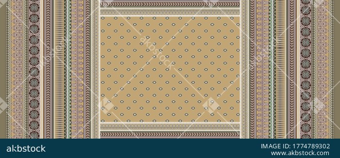 A sophisticated dupatta design featuring a warm beige center adorned with neatly arranged paisley buti motifs and surrounded by richly detailed ornamental border panels on both sides. The balanced layout, earthy neutral palette, and traditional decorative styling make this design ideal for ethnic wear collections, festive women’s apparel, elegant printed dupattas, and premium textile surface applications.