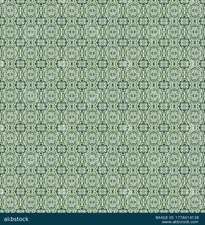 A balanced seamless geometric pattern featuring repeating medallion forms, ornamental tile motifs, and structured connecting elements arranged in a precise allover layout. The soft green and grey palette gives the design a calm decorative character while maintaining enough contrast for clear visual definition. Its symmetrical construction and classic surface rhythm make it suitable for both fashion and home décor categories, especially for buyers looking for a neat non-floral repeat with traditional geometric appeal. This design is ideal for shirts, kurtis, dresses, scarves, cushions, curtains, table linen, upholstery accents, and coordinated interior textile collections. A strong choice for buyers seeking a refined geometric repeat with timeless structure, soft color harmony, and versatile commercial usability.