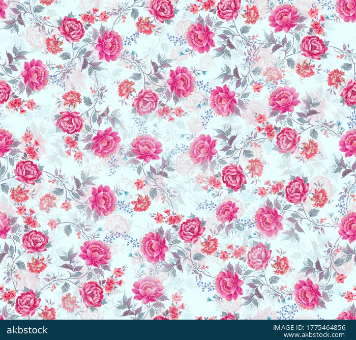 A rich and elegant seamless floral pattern featuring coral pink blooming flowers, soft grey blossoms, and muted green foliage arranged over a deep midnight navy background. This design carries a premium vintage textile appeal with strong visual depth, making it suitable for fashion fabrics, women’s wear, scarves, dupattas, kurti materials, home décor accents, and other surface design applications. The dark base enhances the floral highlights beautifully, giving the overall pattern a refined and luxurious look for both traditional and contemporary product development.