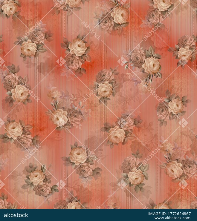 A seamless vintage rose bouquet pattern on a warm coral striped textured background, featuring soft cream and mocha roses with gentle botanical leaves in a classic scattered layout. This design prints best with digital pigment printing on cotton, rayon, and viscose for women’s apparel, and also looks premium on satin, crepe, and georgette for scarves, dupattas, and flowy dresses. Ideal for fashion textiles, wallpaper, bedding, curtains, and elegant surface design projects.