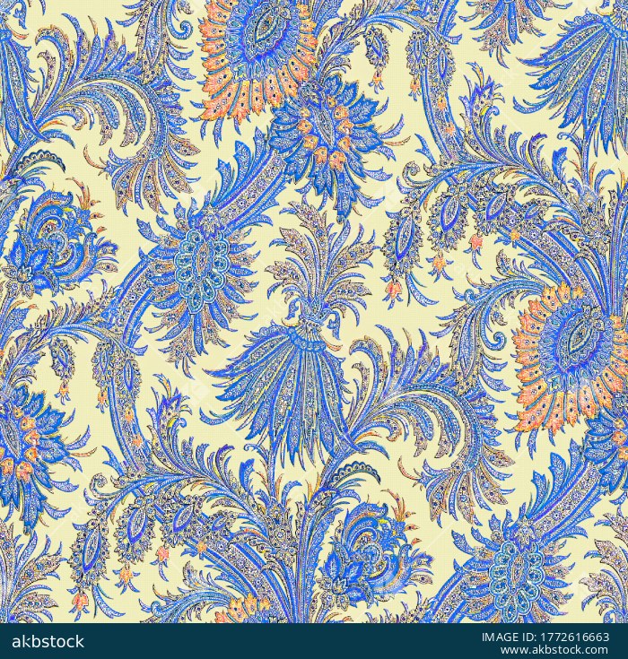 This seamless ornamental pattern features intricate feathered paisley plumes, stylized botanical flourishes, and fine decorative detailing in vivid blue with warm orange accents on a soft cream background. The look is rich, festive, and highly detailed, perfect for premium textiles, scarves, ethnic apparel, home décor, upholstery, wallpaper, and statement surface design projects. Created as a continuous repeat for smooth all-over printing.