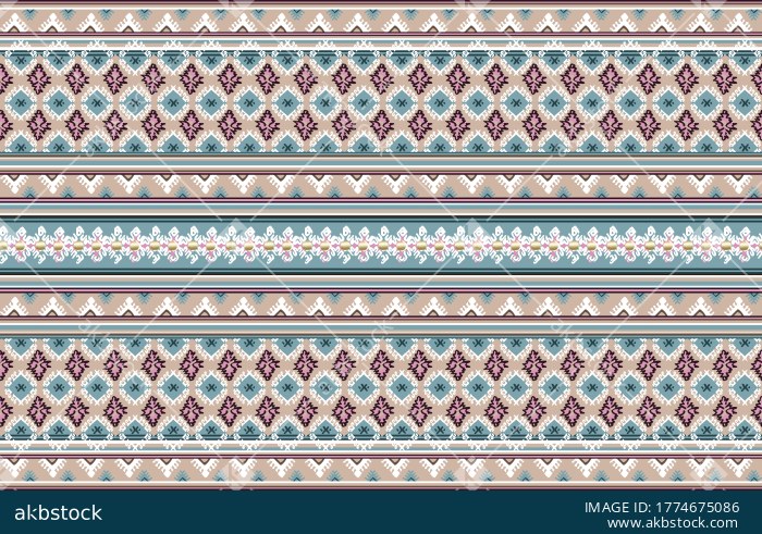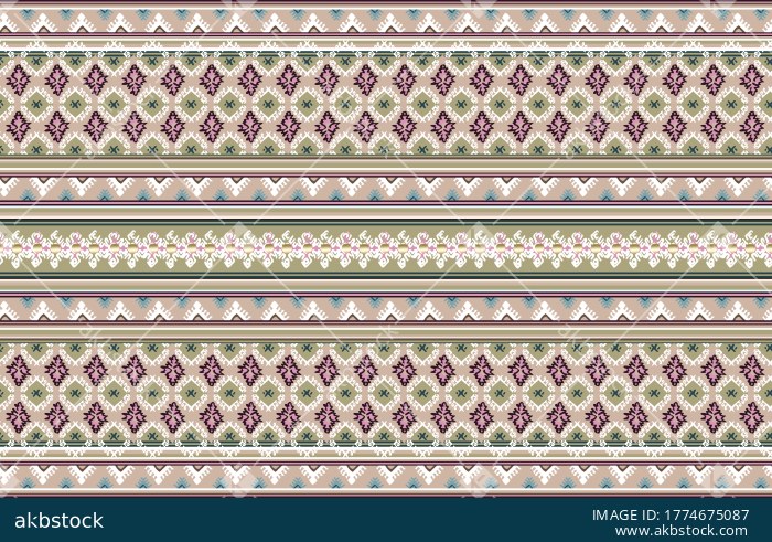 A refined seamless border-style pattern featuring horizontal decorative bands filled with geometric motifs, diamond forms, ornamental stripe details, and small repeating accents arranged in a balanced layered layout. The soft pastel palette of blue, mauve, beige, cream, and muted charcoal gives the design a calm vintage character with a neat decorative surface appeal. Its structured stripe composition makes it highly suitable for buyers seeking a non-floral border repeat that works beautifully across fashion, accessories, and coordinated home textile collections. This design is ideal for dupattas, scarves, kurtis, dresses, border placements, furnishings, table linen, cushions, and decorative textile applications. A strong choice for buyers seeking a classic striped ornamental repeat with elegant rhythm, soft color harmony, and versatile commercial usability.