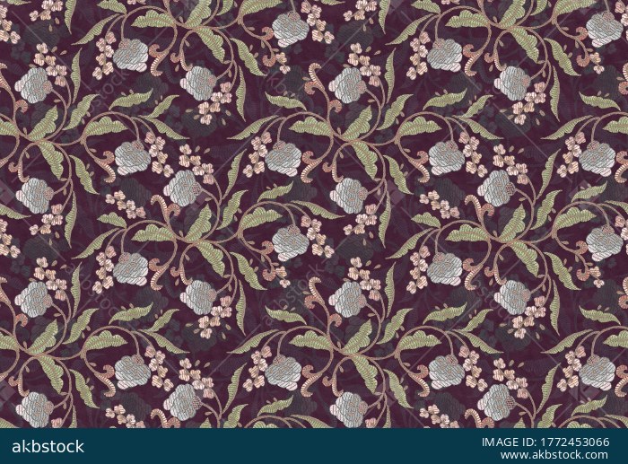This seamless floral pattern showcases delicate silver-toned blossoms, pastel buds, and flowing vine scrolls on a rich deep plum background. The design has a refined woven/embroidered texture feel, giving it a premium classic look for fashion textiles, upholstery, curtains, wallpaper, and premium gift wrap. Built for continuous repeating layouts for all-over surface design applications.