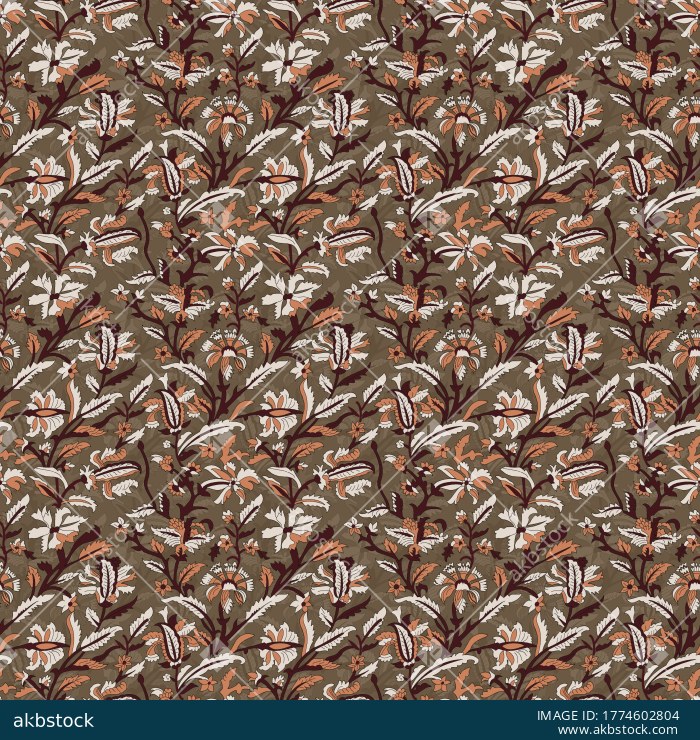 A beautifully arranged seamless floral jaal pattern featuring stylized blossoms, elongated leaves, branching stems, and decorative filler motifs set in a dense allover composition. The design carries a vintage textile character with earthy muted tones, balanced movement, and an elegant hand-drawn surface feel that works well across both fashion and décor collections. Its warm neutral palette gives the pattern a grounded premium look, making it suitable for timeless product lines rather than seasonal use only. This design is ideal for kurtis, dupattas, dresses, scarves, ethnic apparel, furnishing fabrics, cushions, curtains, table linen, and decorative home textile applications. A strong option for buyers seeking a refined traditional floral repeat with soft heritage charm and versatile commercial appeal.