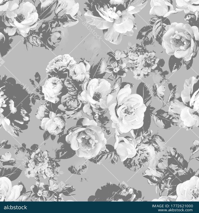 A refined seamless monochrome floral pattern in layered shades of grey, featuring vintage roses, peony-style blooms, and botanical leaves arranged in airy scattered clusters. The artwork has a classic toile-inspired look with painterly texture and soft contrast, making it ideal for premium textiles, fashion prints, home décor, wallpaper, bedding, curtains, wrapping paper, and surface design applications.