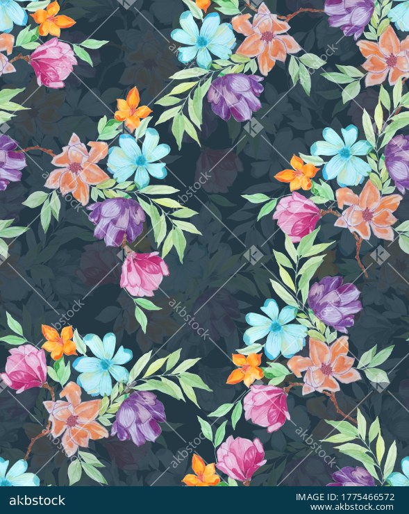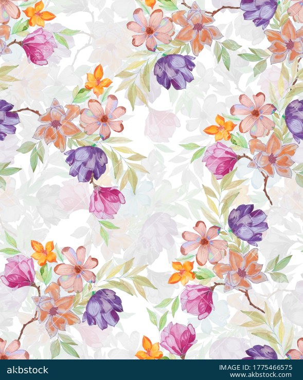 A beautifully balanced seamless floral pattern set featuring hand-painted watercolor flowers, soft leafy branches, and a delicate allover arrangement designed for refined textile and surface applications. This premium design set includes four carefully developed colorways: deep teal, warm brown, rich maroon, and a soft white variation, allowing buyers to choose between bold, moody, and light seasonal moods within one coordinated pattern family. The floral composition blends peach, pink, violet, orange, and fresh green accents with a graceful repeat structure that works well across fashion and home décor developments. Ideal for fabric printing, women’s apparel, scarves, dupattas, kurtis, soft furnishings, boutique collections, and elegant surface design projects requiring a ready-to-use floral repeat with multiple commercial color options.