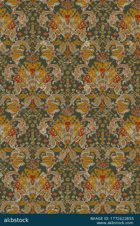 A premium seamless jacquard-style tapestry pattern on a forest green base, featuring symmetrical folk motifs, geometric accents, and ornate decorative elements in mustard, orange, beige, and muted red tones. The woven textile texture effect gives a rich fabric feel, ideal for upholstery, curtains, jackets, winter textiles, home décor fabrics, wallpaper, and high-end surface pattern design projects.