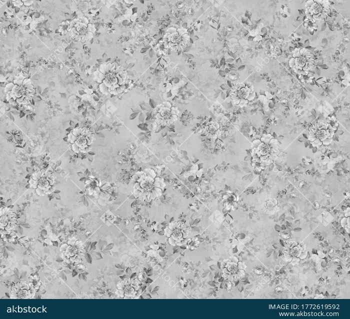 This seamless floral pattern features elegant vintage-style garden blooms arranged across a soft grey monochrome palette with a subtle textured background. The overall look is calm, classic, and premium, ideal for textiles, bedding, curtains, wallpaper, stationery, and timeless surface design applications. Designed as a continuous repeat for smooth all-over printing.