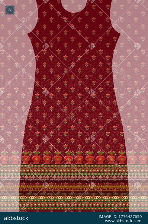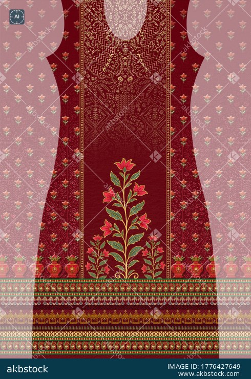 A beautiful traditional kurti panel design featuring a rich maroon/red base with intricate floral buti arrangement, elegant ornamental neckline, central floral placement on the front panel, and coordinated back panel with repeated butis. The design is enhanced with decorative side borders and a multi-layered ethnic bottom border, giving it a graceful Indian heritage look. Suitable for women’s ethnic wear, festive kurtis, casual traditional outfits, and digital textile printing.