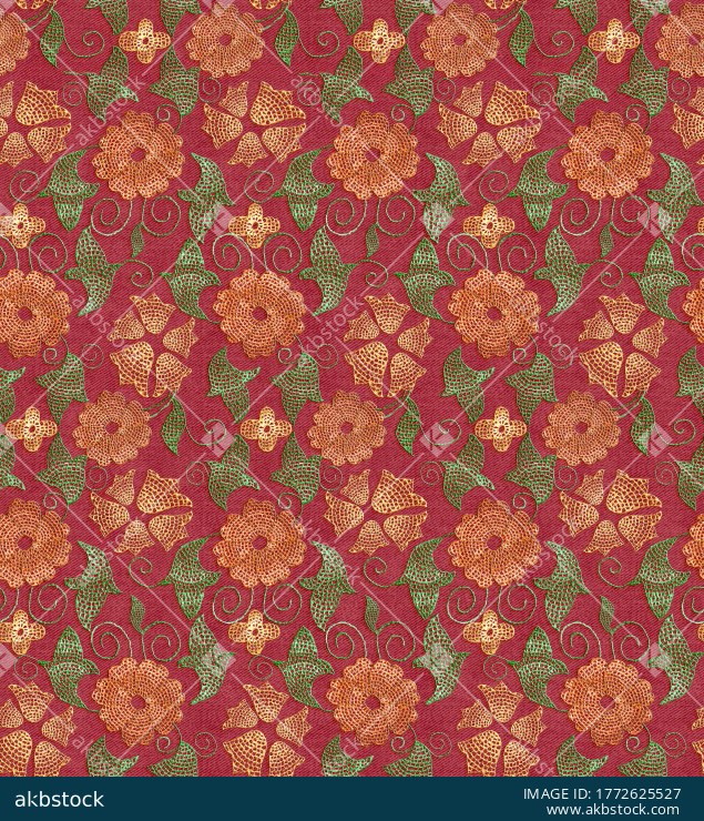 A seamless ethnic floral vine pattern on a rich maroon base, featuring ochre blockprint-style flowers, dotted leaf fills, and swirling vine curls in a handcrafted folk look. This design prints best with reactive or pigment digital printing on cotton, voile, cambric, and rayon for apparel, and also works well on linen blends for home décor. Ideal for kurtis, dresses, dupattas, scarves, bedsheets, cushion covers, and traditional surface design projects.