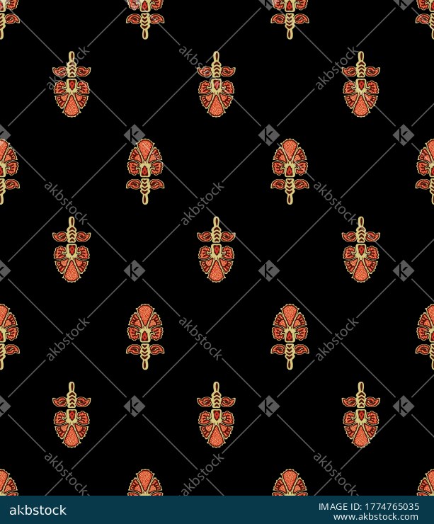 A striking seamless buta pattern featuring bold folk-inspired ornamental motifs arranged in a neat spaced repeat over a deep black background. The glowing ember orange, warm red, and muted beige detailing creates a dramatic handcrafted surface with strong ethnic character and decorative appeal. Suitable for apparel fabrics, kurti prints, blouse materials, dupatta concepts, wallpaper styling, and statement home décor textile collections.
