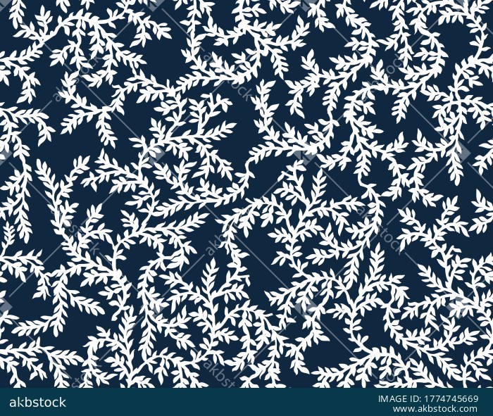 A richly flowing seamless botanical pattern featuring ivory leaf vines spreading across a deep midnight blue background in an organic allover arrangement. The intertwined branches and soft leafy silhouettes create a bold decorative surface with a refined natural rhythm. Ideal for apparel fabrics, kurti prints, home décor textiles, upholstery concepts, wallpaper styling, and premium surface design collections.