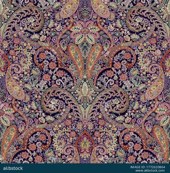 A richly detailed seamless paisley pattern on a deep midnight purple base, filled with intricate floral scrollwork, botanical vines, and ornamental motifs. The design features elegant curved boteh shapes, dense micro-florals, and traditional-inspired detailing in vibrant accent colors, creating a premium vintage look. Ideal for fashion textiles, scarves, ethnic wear, home décor, wallpapers, wrapping paper, and surface design projects.