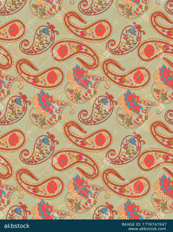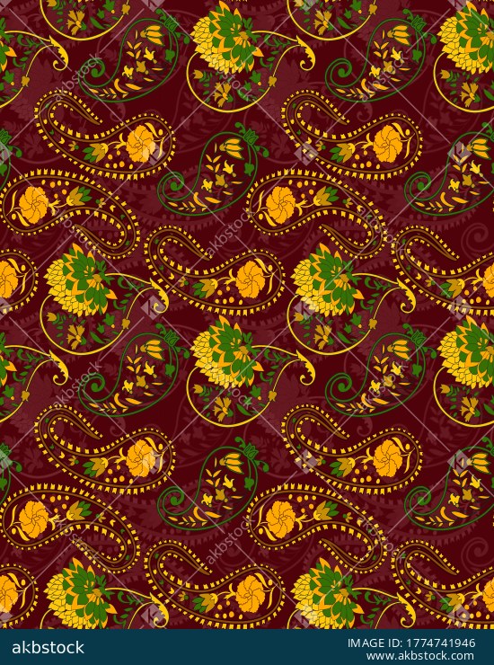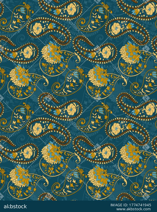 A richly detailed seamless paisley pattern set on a deep midnight teal ground, featuring graceful curved boteh forms, mustard floral blooms, soft cream petals, and delicate vine detailing. The layered composition creates a premium heritage look with a refined decorative rhythm, making it suitable for fashion fabrics, kurti materials, scarves, dupattas, home décor accents, and sophisticated surface design collections.