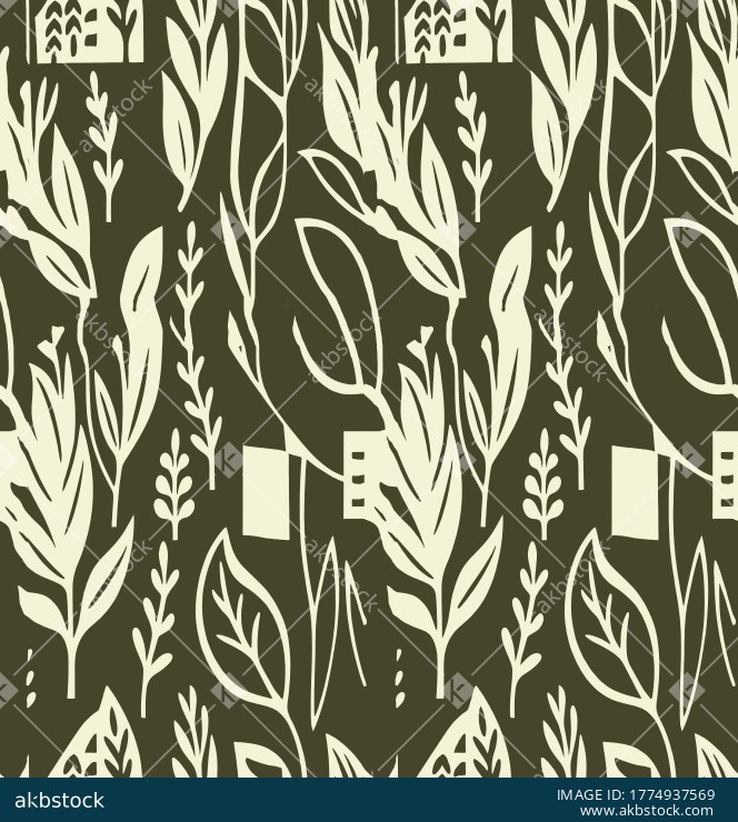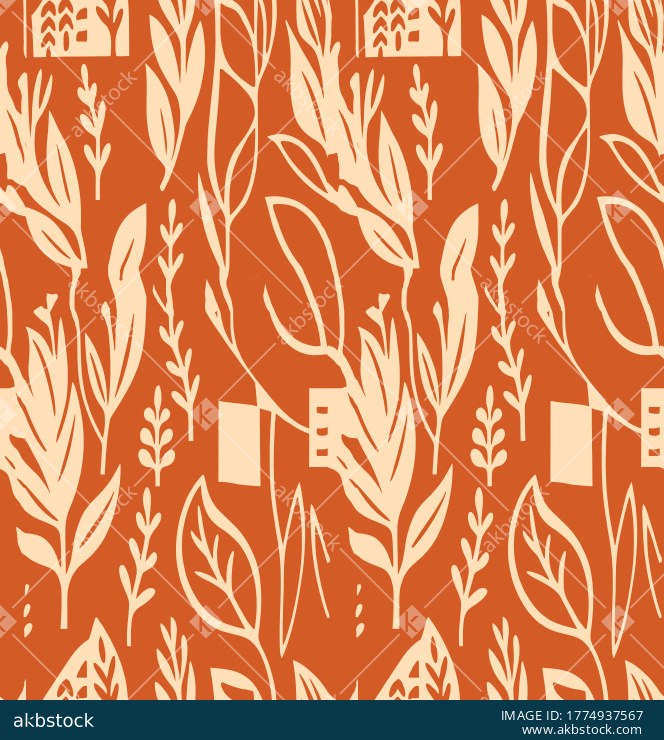 A stylish seamless pattern featuring elongated botanical leaves, simple sprigs, and abstract plant forms arranged in a clean allover repeat over a warm rust orange background. The cream motifs create soft contrast and give the design a modern handcrafted feel with natural decorative appeal. Suitable for apparel fabrics, kurtis, scarves, home décor textiles, and contemporary surface design collections, this pattern is ideal for buyers seeking a minimal botanical print with earthy warmth and versatile styling.