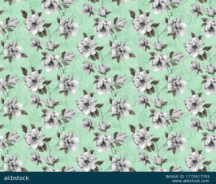 Seamless mint green floral pattern with white magnolia blooms, green leaves, and subtle line-art texture.