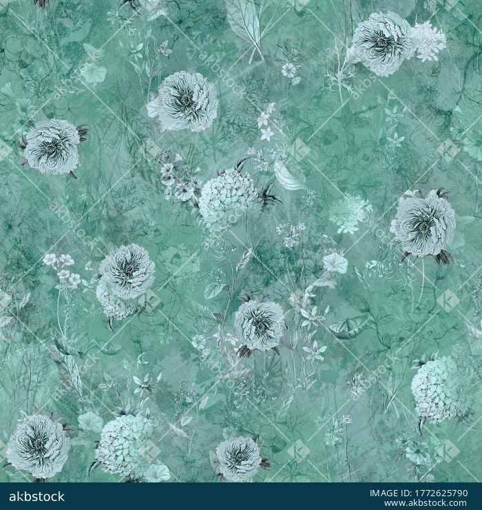 A seamless vintage botanical pattern in mint teal tones, featuring cream blossoms, delicate floral linework, and layered garden elements over a soft textured background. This design prints best with digital pigment printing on cotton, rayon, and viscose for apparel, and also looks premium on satin, crepe, and georgette for scarves and flowy dresses. Ideal for women’s fashion, dupattas, bedding, curtains, wallpaper, and elegant surface design projects.