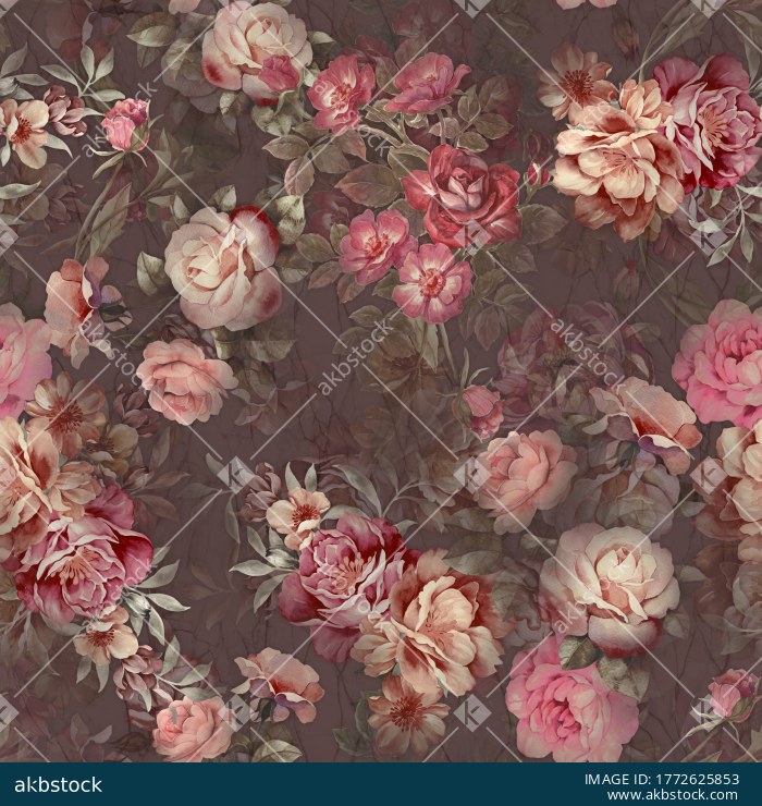 A seamless moody vintage floral pattern on a deep plum brown background, featuring layered rose and peony-style blooms in blush, coral, and dusty pink tones with soft botanical leaves. This design prints best with digital pigment printing on cotton, rayon, and viscose for apparel, and also looks premium on satin, crepe, and georgette for scarves, dupattas, and flowy dresses. Ideal for evening fashion textiles, wallpaper, bedding, curtains, and elegant surface design projects.