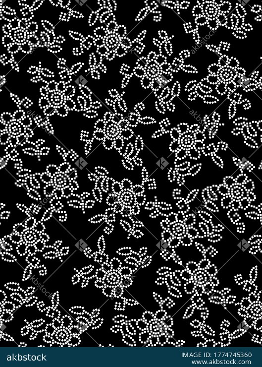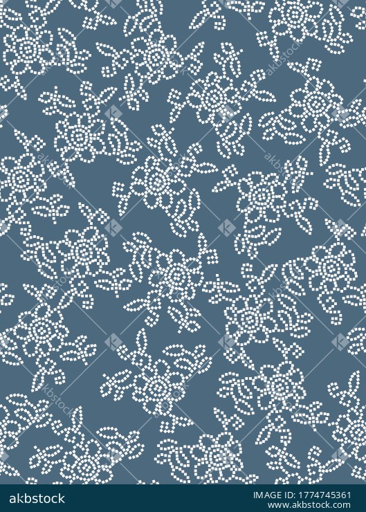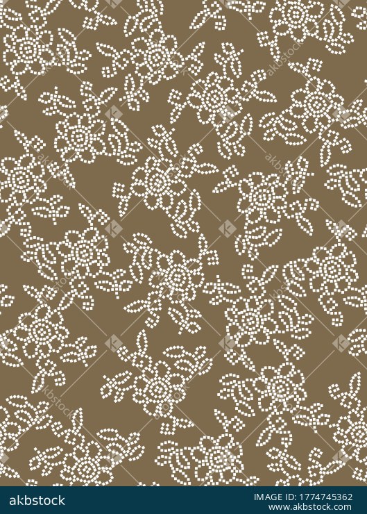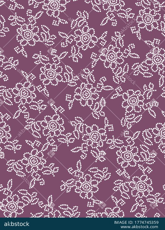 A distinctive seamless floral pattern featuring pixel-like embroidered buta motifs scattered in a balanced allover layout over a rich mulberry ground. The crisp white dotted construction gives the design a handcrafted cross-stitch character while maintaining a soft folk textile appeal. Suitable for apparel fabrics, kurti prints, blouse materials, craft-inspired home décor textiles, wallpaper concepts, and artisanal surface design collections.