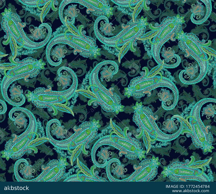 This seamless paisley pattern features richly detailed Kashmiri-inspired boteh motifs in teal, aqua, and green tones on a deep navy background. The design has an ornate heritage look with intricate linework and layered detailing, making it perfect for premium textiles, scarves, shawls, ethnic apparel, upholstery, wallpaper, and luxury surface design projects. Created as a continuous repeat for smooth all-over printing.