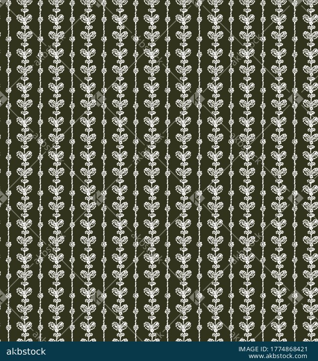 A refined seamless pattern featuring delicate white floral buti vine motifs arranged in neat vertical stripe formations over a deep olive green background. The balanced repeat structure and subtle traditional styling give this design a graceful ethnic character, making it suitable for fashion fabrics, ethnic wear, home décor textiles, scarves, linings, and elegant printed surface applications.
