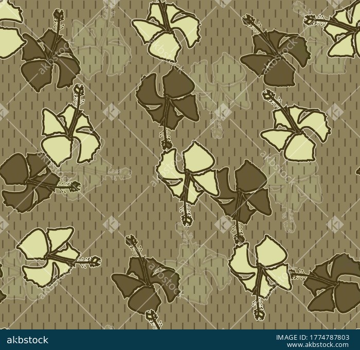 A stylish seamless tropical floral pattern featuring simplified hibiscus motifs arranged across an olive green background with subtle vertical texture detailing. The soft tonal palette and clean botanical layout give this repeat design a calm modern ethnic character, making it suitable for fashion fabrics, home décor textiles, scarves, wallpapers, and versatile surface design applications.
