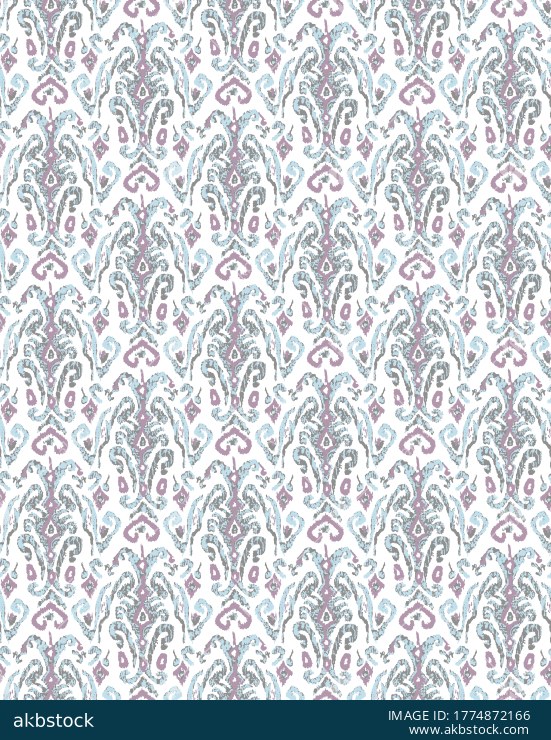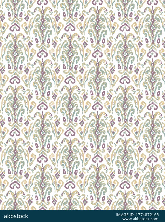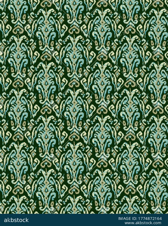 A richly decorative seamless pattern featuring stylized ikat inspired motifs arranged in a vertical rhythmic repeat over a deep green ground. The design blends soft aqua, beige, and muted olive tones to create a refined ethnic surface with a handcrafted visual character. Suitable for apparel fabrics, kurti materials, scarves, upholstery concepts, and home décor textiles, this pattern offers strong ornamental appeal with a timeless traditional touch.