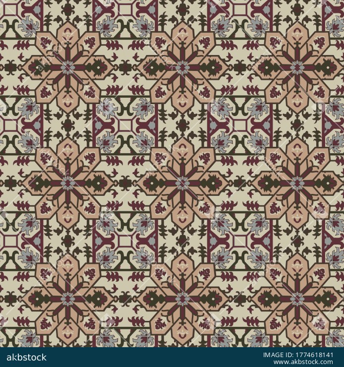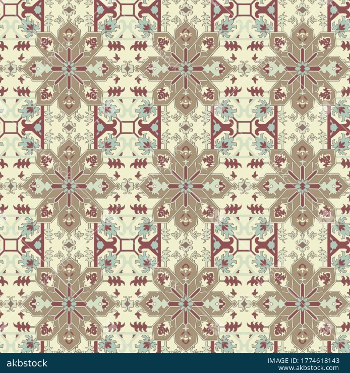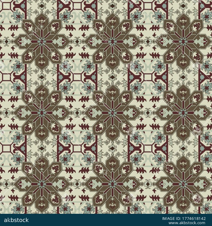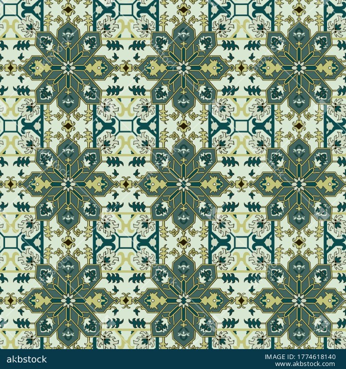 A refined seamless ornamental pattern featuring large tile-style medallions, geometric connectors, and decorative motifs arranged in a precise allover layout. The sage, teal, cream, and muted olive palette gives the design a calm heritage character with a polished architectural feel. Its structured symmetry and tiled rhythm make it highly suitable for both fashion and interior textile categories, especially for buyers seeking a non-floral decorative repeat with classic ornamental appeal. This design is ideal for shirts, kurtis, dresses, scarves, cushions, curtains, table linen, upholstery accents, and coordinated home décor collections. A strong choice for buyers seeking a balanced tile repeat with timeless structure, decorative richness, and versatile commercial usability.