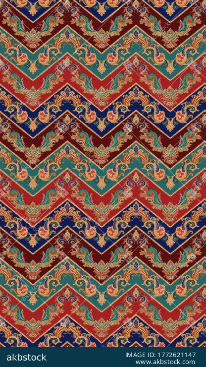 A luxurious seamless chevron pattern filled with ornate damask and baroque scroll motifs in rich royal blue, teal, and deep maroon tones. The design features repeating zigzag bands with intricate ornamental flourishes, gold-inspired detailing, and classic vintage elegance. Perfect for premium textiles, ethnic fashion, upholstery, curtains, wallpaper, packaging, wrapping paper, and high-end surface pattern design projects.