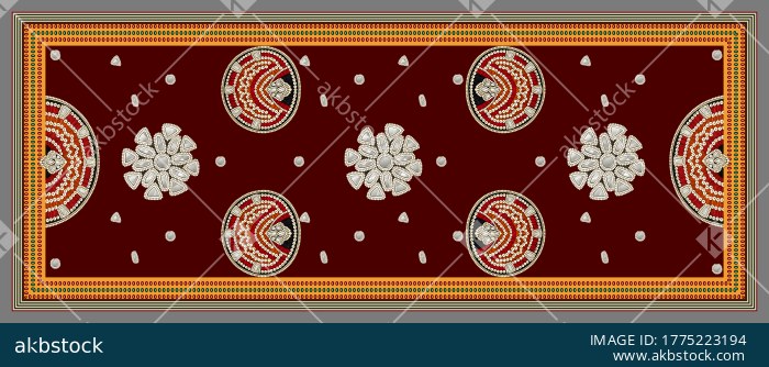 A premium dupatta design created with a rich black base and ornate ethnic stone work inspired motifs arranged in a balanced vertical layout. The design features decorative circular medallion forms, floral jewel style elements, delicate scattered accents, and a detailed traditional border that together create a luxurious festive appeal. Its strong contrast and refined ornamental placement make it suitable for designer ethnic wear, festive dupattas, boutique fashion collections, occasion based styling, and statement textile presentation. This artwork is ideal for buyers looking for a bold traditional dupatta design with a premium embellished look and a clean production ready visual impact.