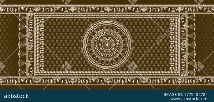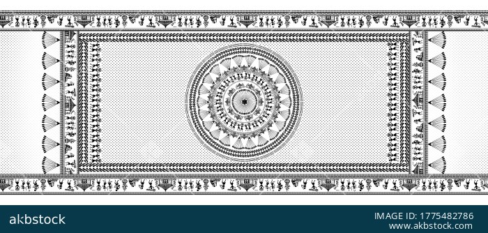 A premium ethnic dupatta design featuring a richly detailed central tribal medallion, fine dotted ground texture, and structured ornamental borders inspired by traditional folk and Warli-style visual elements. The layout is carefully balanced with strong top and bottom border bands, side framing, and a statement circular centerpiece that gives the design a refined heritage look while remaining commercially appealing for modern ethnic fashion. This artwork is ideal for premium dupatta printing, coordinated kurti set developments, boutique ethnic collections, festive apparel ranges, and designer textile projects seeking a bold traditional identity with intricate monochrome detailing and multiple elegant color options.