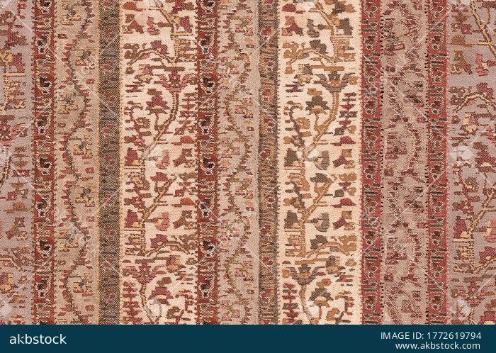 This seamless stripe pattern features vintage-inspired tribal motifs arranged in vertical bands with a rich woven textile texture. The palette blends rust, beige, tan, and muted brown tones, giving an earthy heritage look that suits upholstery, rugs, cushions, curtains, blankets, and rustic fashion textiles. Designed as a continuous repeat for smooth all-over printing.