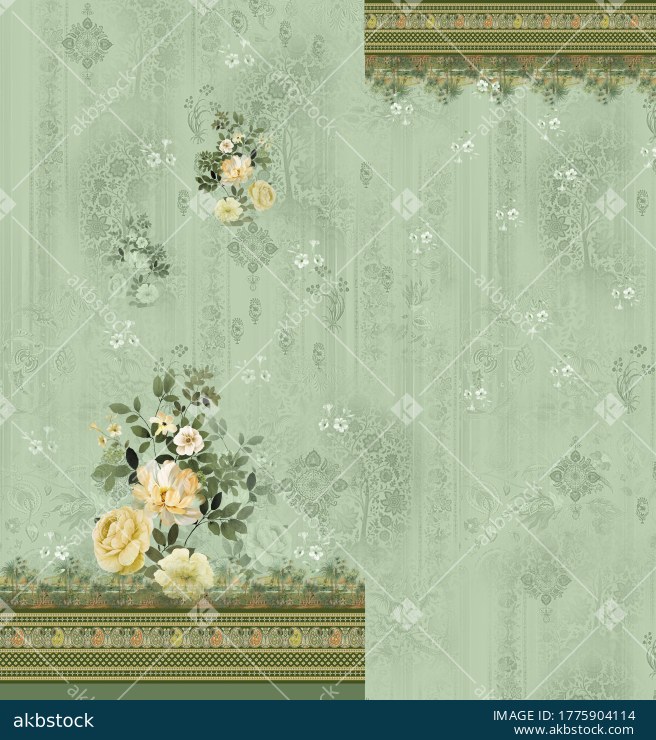 A graceful kurti front panel design in a soft sage green palette, created with a heritage-inspired surface look and coordinated right sleeve placement. The layout features delicate floral bouquets, faded ornamental textures, scattered small blossoms, and richly detailed decorative borders that give the panel an elegant ethnic appearance. This design is suitable for festive kurtis, designer straight suits, premium ethnic wear collections, and boutique-ready garment development. Its balanced composition offers a refined front focus while maintaining a soft allover background feel for a premium stitched result.