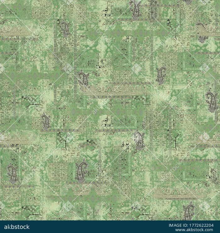 A seamless vintage patchwork pattern in soft sage green and muted neutral tones, created with layered textile panels, ornamental border strips, and scattered paisley motifs. The design has a gently distressed, aged fabric texture that gives a rustic boho collage feel. Perfect for apparel textiles, scarves, quilting-style prints, home décor, wallpaper, wrapping paper, and surface pattern design projects.
