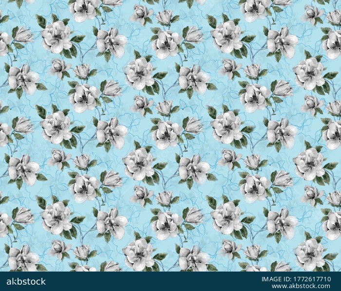 This seamless floral pattern features elegant white magnolia-style blossoms with soft grey shading and natural green leaves on a fresh sky blue background. Subtle botanical line art adds depth and a modern layered look, making it perfect for women’s apparel, kidswear, bedding, curtains, wallpaper, and premium surface design projects. Created as a continuous repeat for smooth all-over printing.