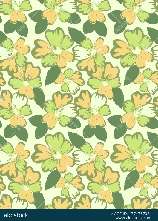 A fresh and elegant seamless floral pattern featuring soft green and muted yellow blossoms paired with hand drawn botanical leaves on a light pastel background. This repeat design brings a calm natural feel and is suitable for fashion fabrics, home textiles, surface pattern projects, wallpapers, wrapping paper, and other production-ready creative applications.