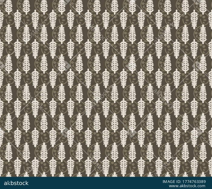 A refined seamless folk-inspired pattern featuring ivory leaf buti motifs arranged in vertical rows over a warm taupe brown background. Soft curved vine shapes and tonal detailing in the ground add gentle movement, giving the design a balanced handcrafted look with a calm traditional character. Suitable for apparel fabrics, kurti prints, blouse materials, lightweight home décor textiles, wallpaper styling, and elegant surface design collections.