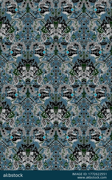 A striking seamless jacquard-style pattern in teal blue, black, and grey tones, featuring symmetrical ornamental folk motifs, small geometric accents, and a woven textile texture effect. The repeating layout feels like a premium tapestry fabric with medallion-style elements and decorative detailing, ideal for upholstery, curtains, jackets, winter textiles, home décor fabrics, wallpaper, and surface pattern design projects.