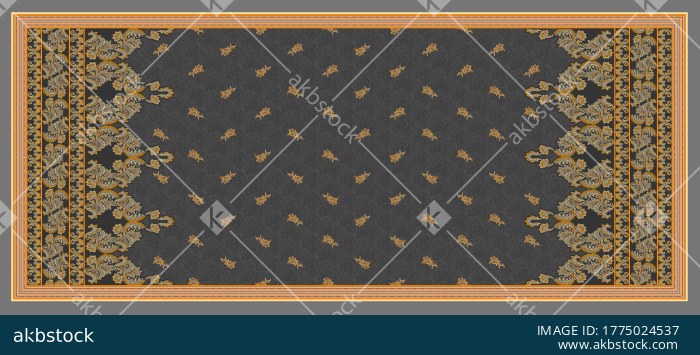 A refined traditional dupatta design featuring a deep charcoal grey base adorned with small orange buti motifs and richly detailed paisley side borders. The composition is framed with multiple ornamental border lines, creating a balanced ethnic layout with classic elegance and strong decorative appeal. Ideal for printed dupattas, festive ethnic wear, timeless fashion collections and premium textile applications, this design offers a graceful blend of subtle center styling and bold traditional border richness.