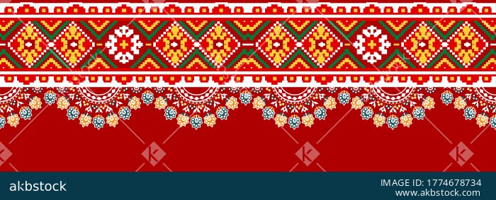 A striking ethnic border design featuring bold geometric diamonds, folk-inspired motifs, stepped decorative bands, and intricate hanging floral mandala details. The rich red base is enhanced with yellow, green, white, teal, and orange accents, creating a vibrant traditional surface pattern ideal for dupatta borders, kurti panels, sari pallus, festive trims, textile placements, and cultural fashion applications.