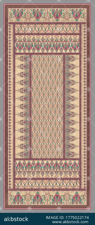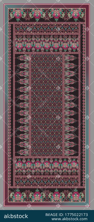 A richly detailed traditional dupatta design featuring layered ornamental panels, intricate floral motifs and geometric repeat elements arranged over a deep maroon base. The composition is enhanced with vibrant magenta and teal highlights, decorative side borders and a structured central layout that creates a strong ethnic statement. Ideal for festive dupattas, ethnic wear collections, statement fashion textiles and premium printed fabrics, this design offers bold heritage character with refined decorative appeal.