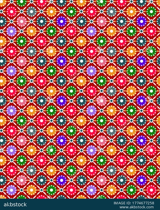 A lively seamless geometric pattern featuring repeating diamond motifs with dotted circular centers arranged in a tight allover layout. The bright multicolor palette set against a rich red ground creates a festive decorative surface with strong visual energy and playful rhythm. Its compact repeat and bold contrast make the design highly suitable for buyers seeking an eye-catching non-floral print for fashion, accessories, and statement home textile applications. This pattern is ideal for kurtis, dresses, shirts, scarves, kidswear, festive apparel, cushions, curtains, table linen, and decorative fabric collections. A strong choice for buyers seeking a colorful geometric repeat with cheerful character, graphic clarity, and broad commercial usability.