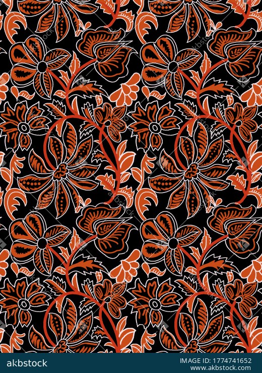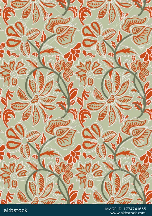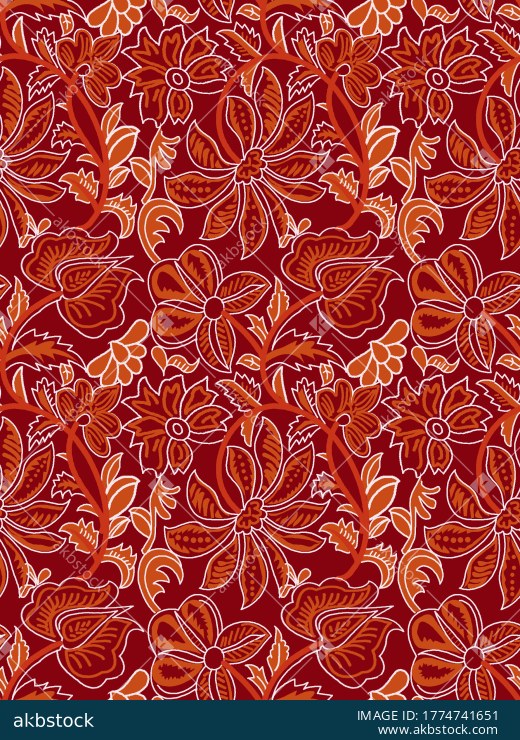 A lively seamless floral pattern featuring bold hand drawn botanical motifs, flowing vines, and decorative blossoms arranged in an energetic allover repeat. The rich red background is enhanced with warm orange, rust, and white accents, giving the design a strong folk inspired and artisanal textile character. Ideal for apparel fabrics, kurti prints, statement home décor textiles, festive surface design collections, and vibrant fashion applications.