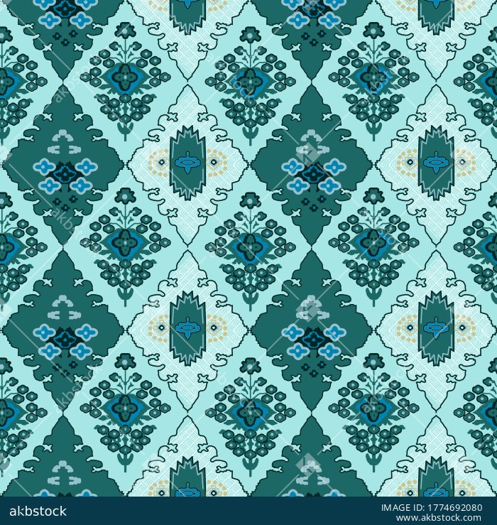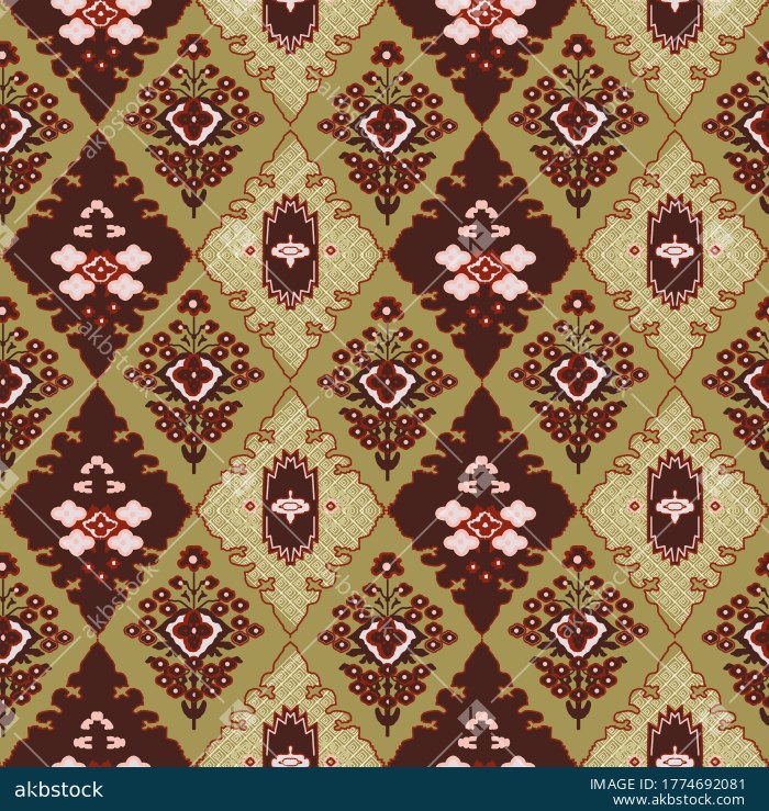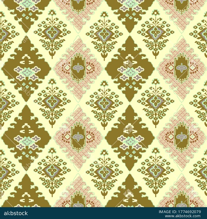 A refined seamless ethnic pattern featuring stylized floral sprigs, ornamental medallion forms, and geometric decorative motifs arranged in a balanced vertical repeat. The soft earthy palette of olive brown, sage mint, blush pink, and pale cream gives the design a calm vintage character, making it suitable for apparel fabrics, kurti prints, home décor textiles, surface design collections, wallpaper concepts, and traditional inspired fashion applications.