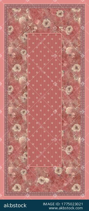 A graceful vintage-style dupatta design featuring a richly textured dusty rose floral border with soft blooming motifs and a neatly arranged central panel filled with delicate buti accents. The composition creates a calm and elegant ethnic look with refined frame detailing and balanced surface decoration throughout. Ideal for printed dupattas, feminine ethnic wear, pastel fashion collections and premium textile applications, this design offers timeless floral charm with a soft romantic appeal.