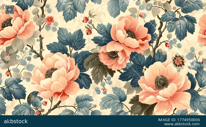 A beautifully balanced vintage-inspired seamless pattern featuring large peach blossoms, layered blue leaves and delicate berry accents arranged over a soft cream background. The design carries a graceful floral character with a refined decorative flow, making it ideal for women’s fashion, scarves, home décor textiles, printed fabrics and elegant surface design collections. Its soft color palette and timeless botanical styling give it a premium and versatile appeal for both classic and modern applications.