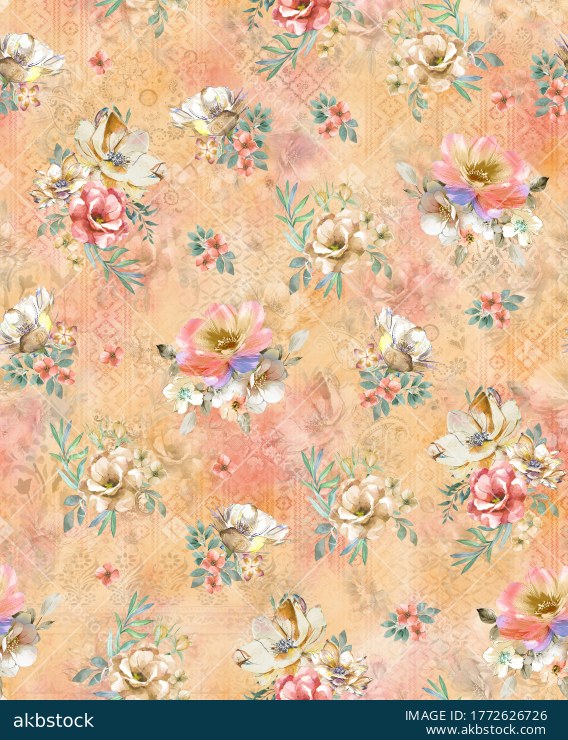 A seamless watercolor floral pattern on a warm apricot background with subtle ethnic texture, featuring soft pastel bouquets, pink blossoms, cream flowers, and fresh leafy accents. This design prints best with digital pigment printing on cotton, rayon, and viscose for women’s apparel, and also looks premium on chiffon, georgette, satin, and crepe for scarves, dupattas, and flowy dresses. Ideal for summer fashion textiles, kidswear, home décor, bedding, and elegant surface design projects.